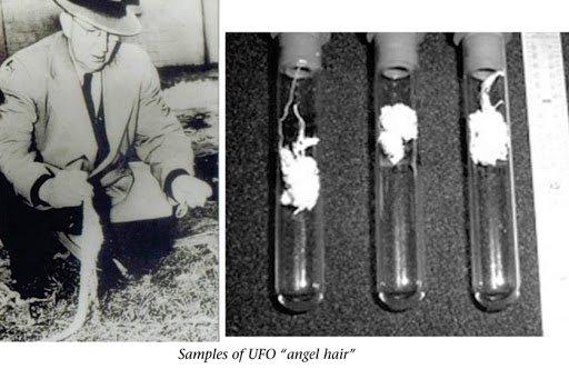 A cobweb-like and jellylike substance which is also slightly radioactive often falls to the ground shortly after UFO sightings. The substance dubbed “angel’s hair” evaporates without a trace several hours after the sighting. The “hair” was reported to either disintegrate or turn into cottony tufts with an offensive smell when held in the hand. American urologists’ refer to the material as “angel’s hair”; Italians call it “siliceous cotton”; and the French use the term “the Madonna’s present” to describe semitransparent threads that fall from heavens.
