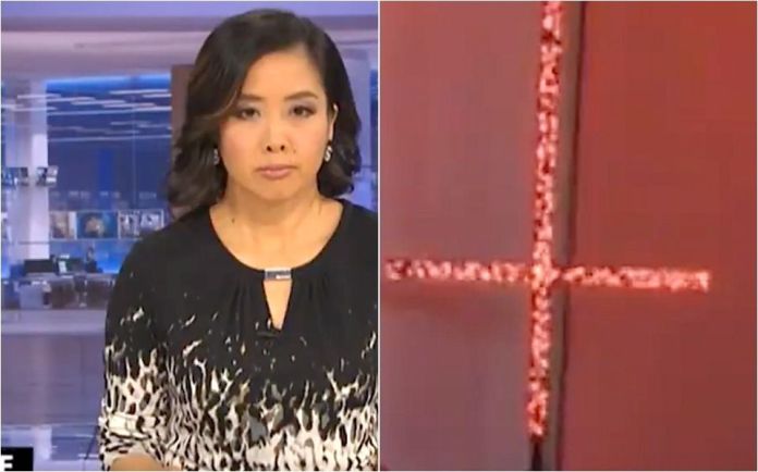 One of them loudly shouts, ‘Hail, Satan!’, before ABC returns to news anchor Yvonne Yong in the studio.