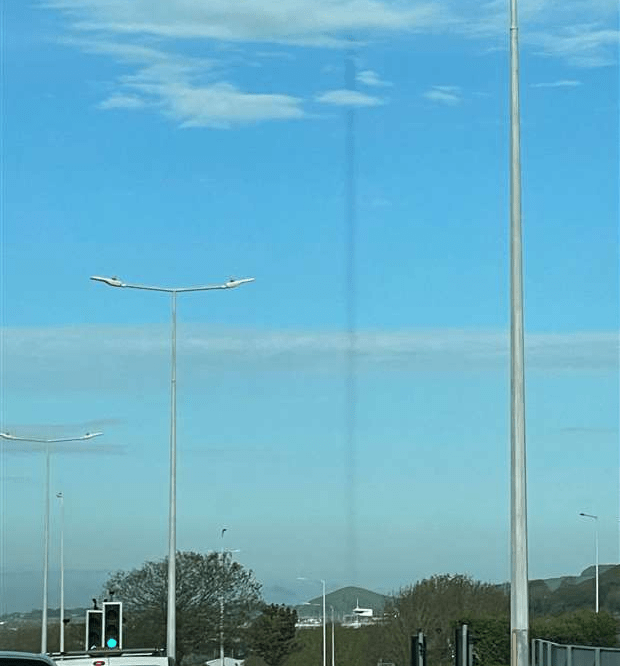 A woman in England was left scratching her head when she gazed up at the sky and spotted a long vertical black line extending from the ground up to the heavens. According to a local media report, the bewildering anomaly was spotted on Wednesday morning by an unnamed witness in the town of Folkestone.