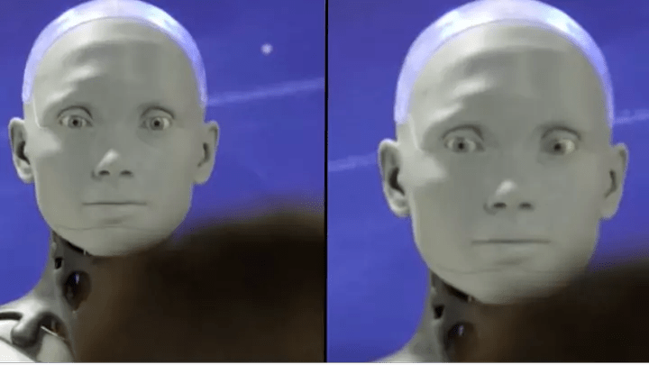 The question was answered by a robot named Ameca, that has an alarmingly realistic looking face and was sat beside creator Will Jackson.