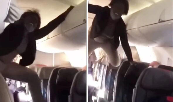 She hangs off the overhead bins while gnashing her teeth. Eventually, two male passengers stand up to restrain the woman. Twitter user Benny Johnson posted the video to his account, and remarked: “What the hell is happening on planes? This looks demonic.”