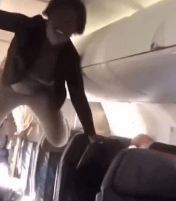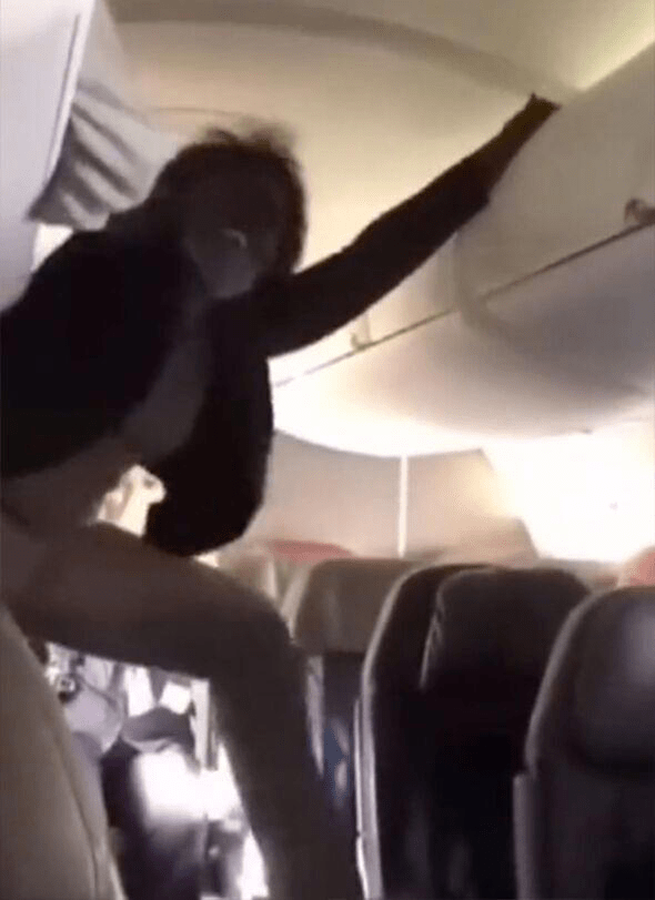 The video shows a woman screaming during a flight. She shouts a number of expletives, including the word “b*tch”, while climbing between the seats on the plane. A flight attendant urges the woman to get back in her seat, but the request falls on deaf ears. The woman gestures wilding and flails around as she makes a number of unintelligible sounds.