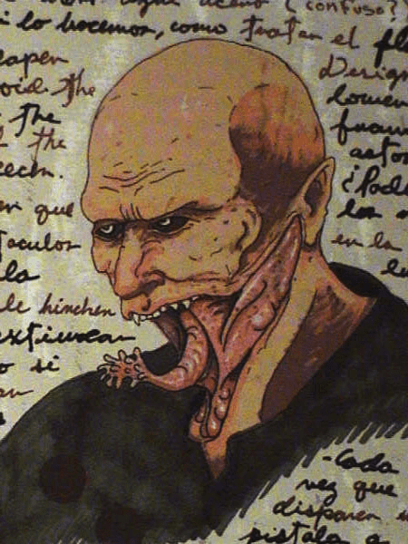 Several of del Toro’s sketches (as well as drawings from his previous films) appeared as part of a now-defunct Film.com article and eventually made their way onto Imgur, where they’ve remained available. Del Toro’s designs reveal his phantasmagoric vision for the film – and that he had actor David Paymer in mind for a role. One image shows a humanoid figure twisted and gnarled into a monstrous form.