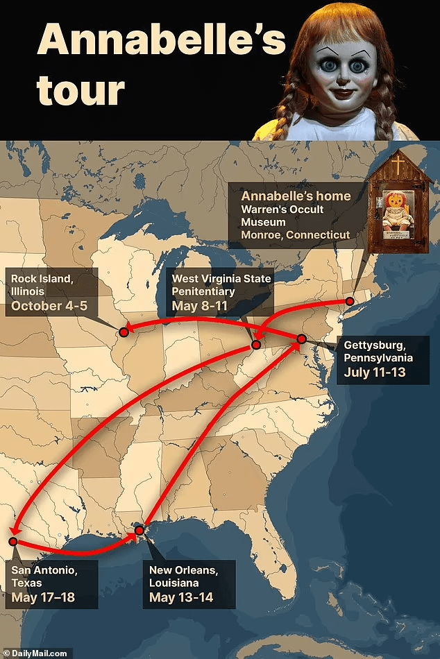 Annabelle, a famously haunted Raggedy Anne doll, started a tour earlier this month ahead of a Psychic Festival, making stops in West Virginia, Louisiana, and Texas.
